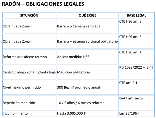 En Zona II es obligatorio instalar barrera más sistema adicional. Además, el RD 1029/2022 y la IS-47 obligan a medir si es centro de trabajo en planta baja o sótano. No hacerlo puede suponer sanciones según la Ley 25/1964.”