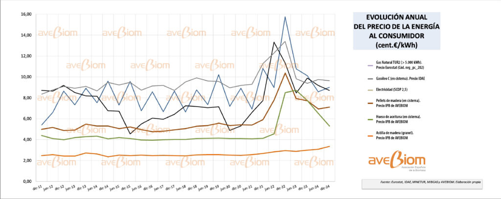 En diciembre de 2024, la astilla se situó como la energía más barata (3,35 c€/kWh), seguida del hueso (5,31 c€/kWh) y el pellet (7,11 c€/kWh), muy por debajo del gasóleo (8,71 c€/kWh), el gas natural (9,01 c€/kWh), la bomba de calor (9,63 c€/kWh para un SCOP realista de 2,5) y la electricidad (24,08 c€/kWh).