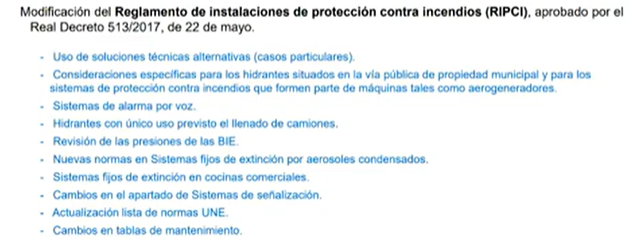 Del anterior video, extraemos en el anexo a modo de resumen y recordatorio las principales novedades de las modificaciones legales de la legislación contra incendios de los últimos años (RIPCI y CTE) y la próxima por publicar: